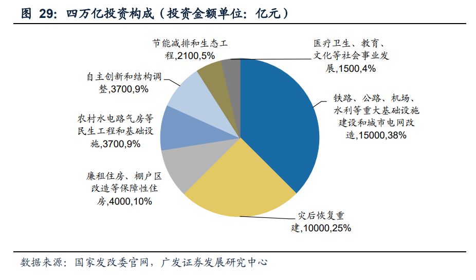 第一次稳增长(2008Q3—2009):2008年下半年,随着美国次贷危机影响的进一步 扩大,海外需求减弱对我国经济的冲击明显加大。为缓解经济下行压力,央行逐渐 放松货币政策,在9月之后分别进行了4次降准和5次降息,货币政策迎来全面宽松时 期。同年11月,国务院常务会议研究部署进一步扩大内需、促进经济平稳较快增长 的十项措施,初步匡算,实施这些工程建设到2010年底约需投资4万亿元,具体包括: 铁路、公路、机场、水利等重大基础设施建设和城市电网改造1.5万亿,灾后恢复重 建1万亿,农村水电路气房等民生工程和基础设施0.37万亿,廉租住房、棚户区改造 等保障性住房0.4万亿,节能减排和生态工程0.21万亿,医疗教育文化等社会事业发 展投资0.15万亿。地方政府重点加码基建、民生类投资,助力稳增长。在“四万亿” 计划的刺激下,基建在稳定经济中发挥出重要作用,08年11月至09年7月期间基建投 资增速和地产投资增速从不到5%分别抬升到51%和31%,建筑行业整体景气度较高。 08年6月大建筑央企的PE(TTM)为29.7倍,尽管与现在相比估值水平较高,但仍低于 同期建筑行业整体PE(34.5倍)。“四万亿”投资刺激为行业带来大量资金,引发 大建筑央企估值修复,至09年8月达到52.8倍。