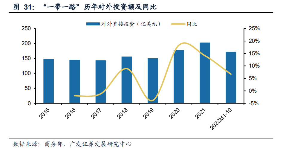“一带一路”近年来对外直接投资额增速虽然有所放缓,但总量一直稳步提升。2022 年1-10月,我国对“一带一路“沿线国家累计直接投资总额172.5亿美元,同比上升 6.68%,近年来,虽然增速略有下滑,但直接投资总额一直保持稳定上升的趋势: 2020年和2021年直接投资总额分别为177.9亿美元和203亿美元,同比增长18.28% 和14.11%。