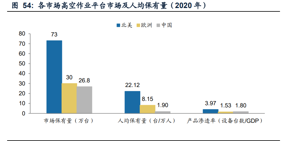 从人均保有量来看,根据华经产业研究院整理的数据,2020年美国/欧洲十国高空作 业平台人均保有量约22.12/8.15台每万人,远高于中国人均保有量的1.90台每万人; 从产品渗透率来看,2020年美国高空作业平台产品渗透率(设备台数与GDP之比) 约3.97台每亿美元,远高于中国/欧洲产品渗透率1.80/1.53台每亿美元。对标欧美成 熟市场,无论从总保有量、人均保有量还是产品渗透率来看,中国高空作业平台市 场潜力巨大,未来至少还有5-10倍成长空间。