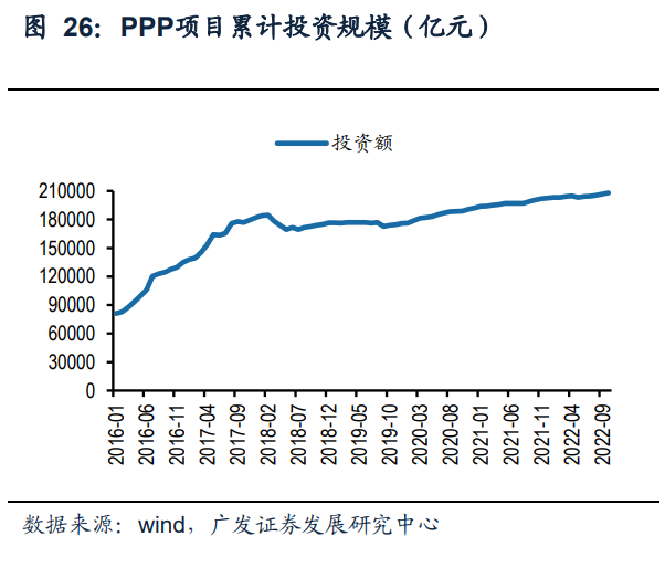 PPP模式为基建投资资金来源提供了一条重要途径。PPP模式,全称为政府和社会 资本合作(Public-Private Partnership),在2014年9月24日的财政部《关于推广运 用政府和社会资本合作模式有关问题的通知》中第一次被提及,被表述为在基础设 施及公共服务领域建立的一种长期合作关系。PPP项目的一般模式为社会资本方承 担设计、建设、运营、维护基础设施的大部分工作,并通过“使用者付费”及必要的 “政府付费”获得合理投资回报;政府部门负责基础设施及公共服务价格和质量监 督,以保证公共利益最大化。PPP项目操作流程分为五个阶段:项目识别、项目准 备、项目采购、项目执行、项目移交。PPP项目的运作方式主要包括委托运营(O& M)、管理合同(MC)、建设-运营-移交(BOT)、建设-拥有-运营(BOO)、转让 -运营-移交(TOT)和改建-运营-移交(ROT)以及这些方式的组合等。项目运作方 式的选择主要由收费定价机制、项目投资收益水平、风险分配基本框架、融资需求、 改扩建需求和期满处置等因素决定。在实际操作中,BOT模式是PPP项目最主要的 运作方式,截至2022年10月,BOT模式的项目数量占全部PPP项目数量的75%以上。