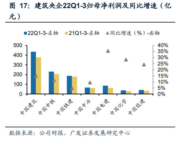 订单层面看,建筑央企22年前三季度新签订单全部实现正增长,中国建筑/中国铁建 /中国中铁/中国电建/中国化学/中国中冶/中国能建2022Q1-3新签订单金额同比分别 增长14.0%/17.7%/35.2%/48.5%/36.7%/7.6%/17.3%。