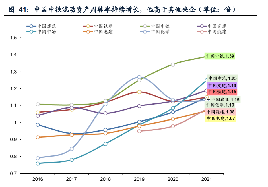 对于市场的第二点担心,近几年建筑央企的资产负债率持续走低,应收账款账龄较 短,且应收账款及存货周转率提升。8大建筑央企中中国建筑及中国铁建应收账款总 数明显高于其他央企,分别达到2139.39亿元与1681.46亿元。从不同账龄应收账款 占比来看,各建筑央企的1年以内应收账款均占60%以上,其中中国铁建、中国中铁 与中国能建的1年以内应收账款占比在70%以上,高于其他央企。中国化学3年及以 上应收账款占比较高,达17.0%。总体来看,建筑央企的账龄结构较短,发生坏账的 风险处于较低水平。