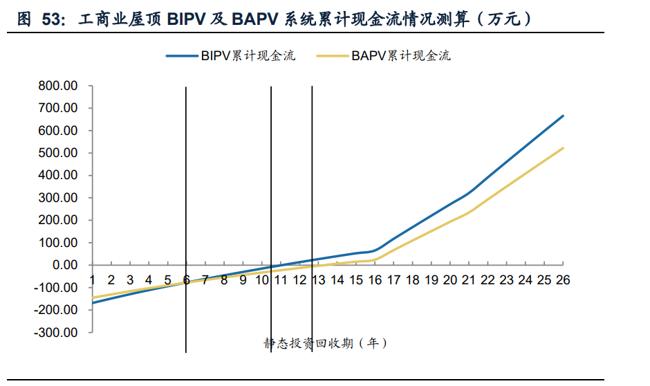 通过搭建模型进行简单测算可以得出,基于之前假设下工商业屋顶BIPV系统的静态 投资回收期约10.0年,项目IRR约12.3%,工商业屋顶BAPV系统的静态投资回收期 约12.3年,项目IRR约11.1%。 综合来看,BIPV系统具备更好的经济性与投资回报。分析二者项目年限内累计现金 流情况可看到,尽管BAPV系统在初始投资方面具有略微优势,但现金流整体增速不 及BIPV系统,运行6-7年后会被BIPV超越,达到投资回收期时间也比BIPV系统更长, 后期二者收益差距进一步拉大。