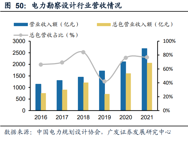 电力勘察设计行业整体的发展状况方面,中国电力规划设计协会发布的数据显示, 2021年行业新签合同金额为4919.79亿元,较2016年增长了2744.51亿元,年均复合 增长率达到17.73%;其中新签总承包合同额4351.16亿元,较2016年增长2597.30亿 元,年均复合增长率达到19.93%。在营业收入方面,2021年电力勘察设计行业营收 2684.21亿元,较2016年增长1545.65亿元,年均复合增长率达到18.71%;其中总承 包业务实现营收2063.40亿元,较2016年增长了1308.29亿元,年均复合增长率达 22.27%。2016年到2021年,总包业务新签合同额占比从80.63%上升至88.44%,总 包业务营收占比从66.32%上升至76.87%。